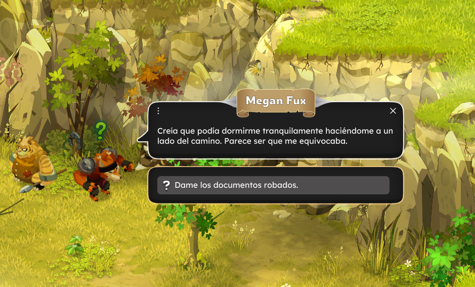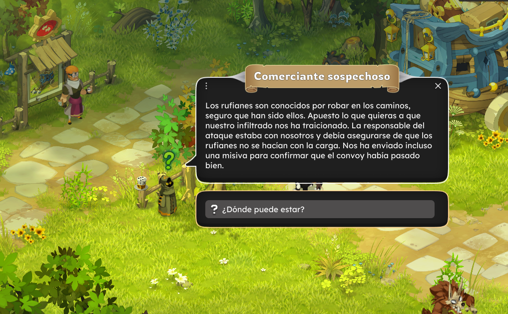 Dirígete a la diligencia de Astrub [0,-18] para hablar con Manu Scrito y luego con el Comerciante sospechoso.