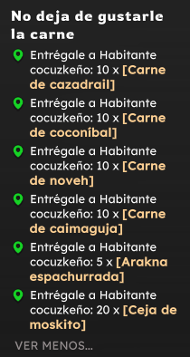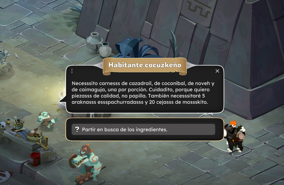 Una vez tengas todos los ingredientes, vuelve a hablar con el Habitante cocuzkeño [-84,-15] y entrégale todo.