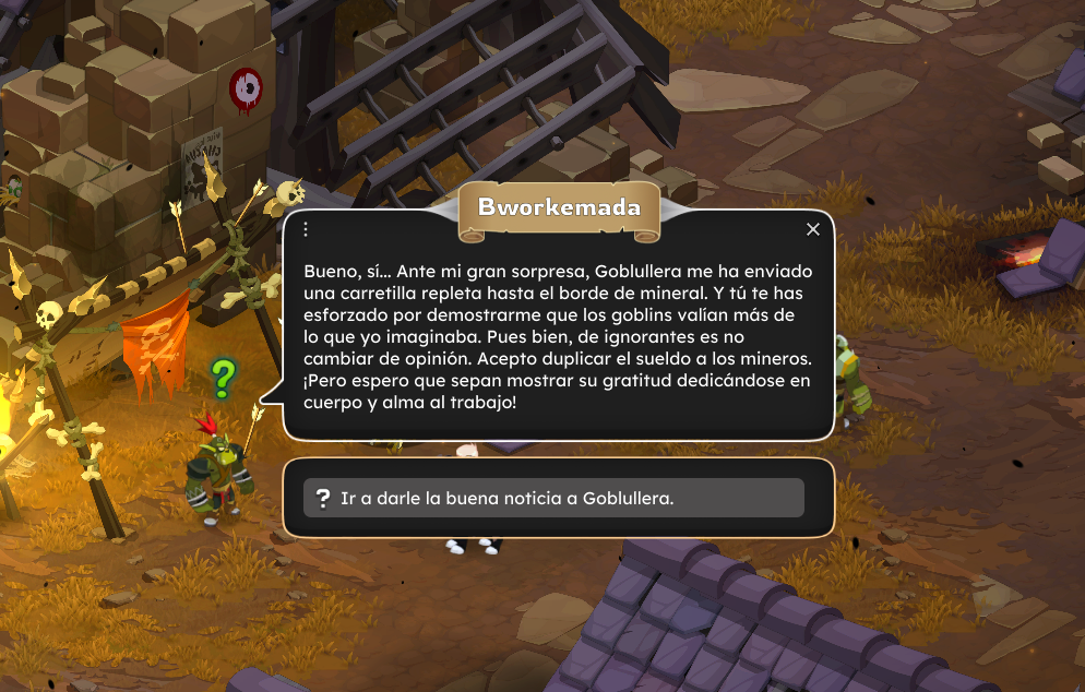 Por último, vuelve a hablar con Goblullera [-17,21] para anunciarle que Bworkemada acepta duplicarles el salario (pasarán de 1 kama a 2 kamas akjsjaksjaksj).